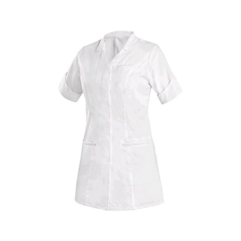 Dámska biela halena s krátkym rukávom, princesový strih, kryté zapínanie na gombíky, 3 predné vrecká zdobené saténovým lemovaním.